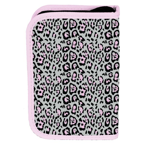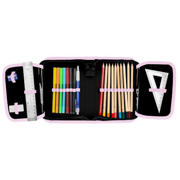 Piórnik jednokomorowy z dwoma klapkami z wyposażeniem (długopis, ołówek, 7 pisaków, 9 kredek, gumka, linijka, temperówka, ekierka). Zadrukowane kolorowe wnętrze.19,5x13x3,5