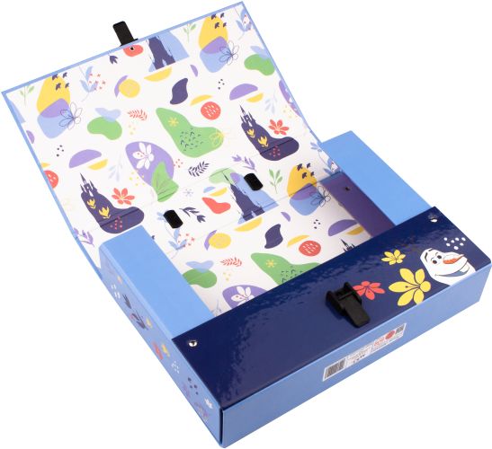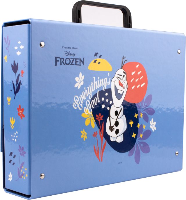 Teczka walizeczka - kartonowa/sztywna teczka z rączką, zapinana plastikowym mechanizmem z przodu. Doskonała dla przechowywania i przenoszenia zeszytów, brulionów, dokumentów, zdjęć, bloków rysunkowych, kredek i wielu innych. Kolorowa na zewnątrz, pokryta połyskową folią, wewnątrz zadruk w jednym kolorze dopasowany kolorystycznie do zewnętrznej części teczki. Motyw z serii Frozen.