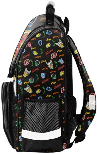 Tornister szkolny. Jedna obszerna komora z wewnętrzynym przedziałem. Na przodzie zapinana kieszeń. Dwie kieszenie po bokach: jedna z siatki, druga zapinana na zamek. Ergonomicznie ukształtowane, sztywne plecy. Wygodnie wyprofilowane szelki. Wymiary: 36x28x15