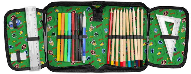 Piórnik jednokomorowy z dwoma klapkami z wyposażeniem (długopis, ołówek, 7 pisaków, 9 kredek, gumka, linijka, temperówka, ekierka). Zadrukowane kolorowe wnętrze. Wymiary: 19,5x13x3,5