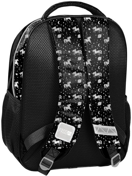 Plecak dwukomorowy szkolny, jedna płaska mała kieszeń na froncie, dwie boczne kieszenie z siatki (mieszczą małą butelkę, bidon lub termos). Elementy odblaskowe, usztywnione plecy pokryte siatką. Wygodny uchwyt do przenoszenia. Wygodne pullery ułatwiające odpinanie zamków.41x31x15