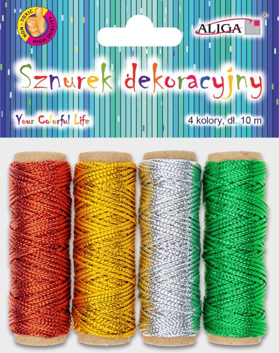 Aliga » Artykuły Dekoracyjne Całoroczne » Sznurki » Sznurek dekoracyjny SZ-2929 metalizowany, rozm. 1, 5mm x 10m, op. zaw. 4 kolory