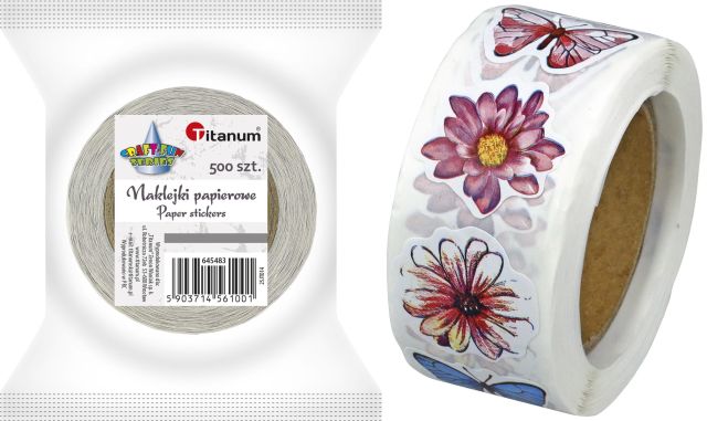 Titanum » Artykuły dekoracyjne całoroczne » Naklejki Dekoracyjne » Naklejki papierowe na taśmie 8 wzorów motyle, kwiaty mix rozmiarów 500szt. szerokość taśmy 28mm