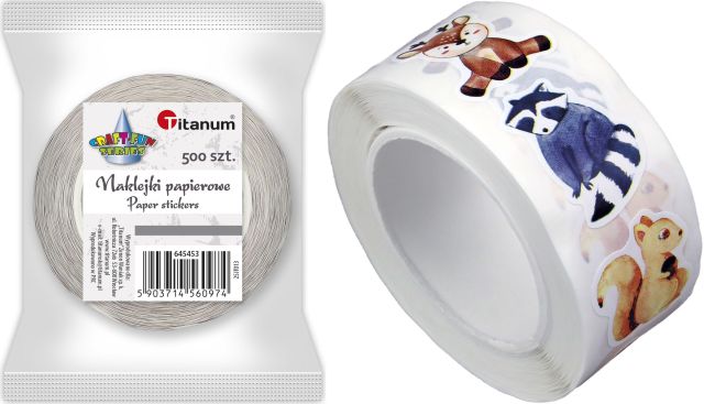 Titanum » Artykuły dekoracyjne całoroczne » Naklejki Dekoracyjne » Naklejki papierowe na taśmie 8 wzorów mix rozmiarów zwierzęta leśne 500szt. szerokość taśmy 27mm