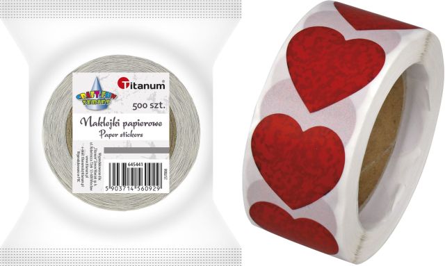 Titanum » Artykuły dekoracyjne całoroczne » Naklejki Dekoracyjne » Naklejki papierowe na taśmie 1 wzór serce marmurowe czerwone 25x25mm 500szt. szerokość taśmy 28mm