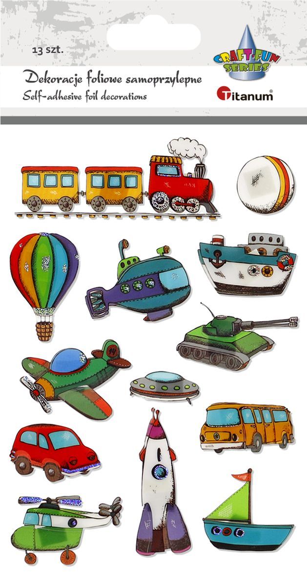 Titanum » Artykuły dekoracyjne całoroczne » Naklejki Dekoracyjne » Naklejki foliowe 3D na piance 3D pojazdy 13szt. pociąg, samolot, balon, rakieta, helikopter, ufo, czołg, autobus, auto, rakieta, statek, żagłówka, łód