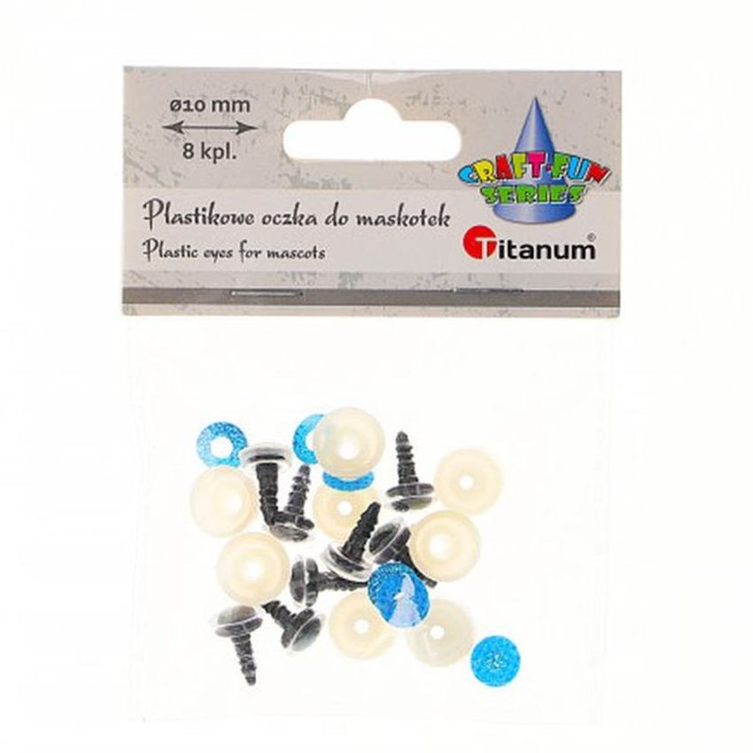 Titanum » Artykuły dekoracyjne całoroczne » Oczka Dekoracyjne » Oczy do maskotek plastikowe O10mm z mocowaniem za pomocą zapinki brokatowe niebieskie 8kpl.