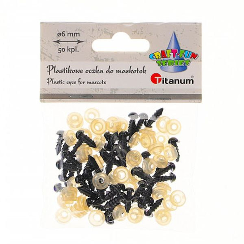 Titanum » Artykuły dekoracyjne całoroczne » Oczka Dekoracyjne » Oczy do maskotek plastikowe O6mm z mocowaniem za pomocą zapinki czarne 50kpl.
