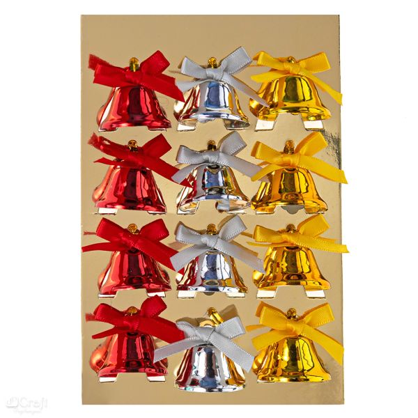 METALOWE DZWONKI Z KOKARDKĄ 12 SZT ZŁOTE, SREBRNE, CZERWONE [opakowanie=6szt]