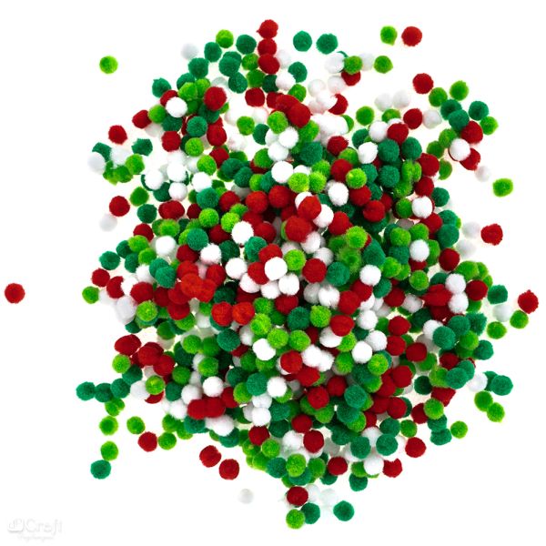 Pompony w rozmiarze 1 cm w kolorach: zielony jasny i ciemny, czerwony, biały opakowanie 1000 szt.