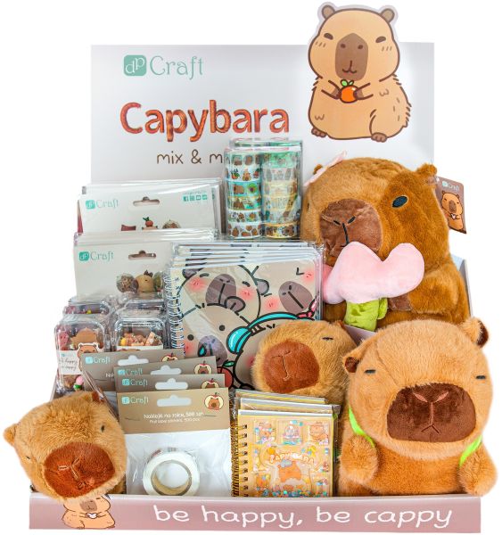 DPCA-027 - NAKLEJKI WINYLOWE - KAPIBARA, 50 SZT - 6 szt.DPCA-029 - OZDOBY POLIMEROWE 3D KAPIBARA, WALIZKA, 20 SZT. - 6 szt.DPCA-030 - ZAWIESZKI POLIMEROWE 3D KAPIBARA, WALIZKA, 20 SZT. - 3 szt.DPCA-031 - ZESTAW TAŚM WASHI KAPIBARA 1,5 CM X 2 M, 12 SZT - 6 szt.DPCA-032 - ZESTAW MATOWYCH BALONÓW FOLIOWYCH KAPIBARA, 6 SZT. - STOKROTKA - 6 szt.DPCA-033 - ZESTAW MATOWYCH BALONÓW FOLIOWYCH KAPIBARA, 5 SZT. - GWIAZDKA - 6 szt.DPCA-034 - NOTESIK NA SPIRALCE Z WODĄ I KONFETTI 10,7 X 8,5 CM, 52 KARTKI - 6 szt.DPCA-035 - NOTES A5 NA SPIRAL - KAPIBARA - 6 szt.DPCA-036 - PLUSZOWA KAPIBARA NA RĘKĘ - 6 szt.DPCA-037 - PLUSZOWA KAPIBARA Z PLECAKIEM 23 CM - 3 szt.DPCA-038 - PLUSZOWA KAPIBARA Z KWIATEM 27 CM - 2 szt.ST-KAPIBARA - DISPALY KAPIBARA - 1 szt.