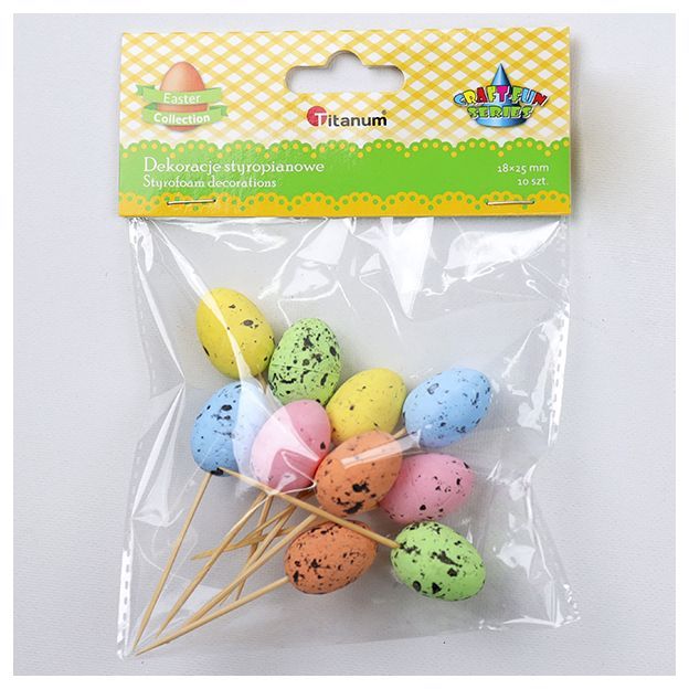 Titanum » Artykuły dekoracyjne całoroczne » Wielkanoc » Dekoracje styropianowe jajka na piku przepiórcze 18x25mm żółte, pomarańczowe, zielone, niebieskie, różowe długość piku ok. 110mm 10szt. TITWLK26