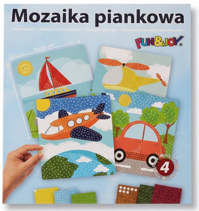 MOZAIKI PIANKOWE W KARTONIKU 4 WZORY: SAMOCHÓD, SAMOLOT, HELIKOPTEER, ŁÓD¬, WYMIARY: 23x25 cm FUNxJOY