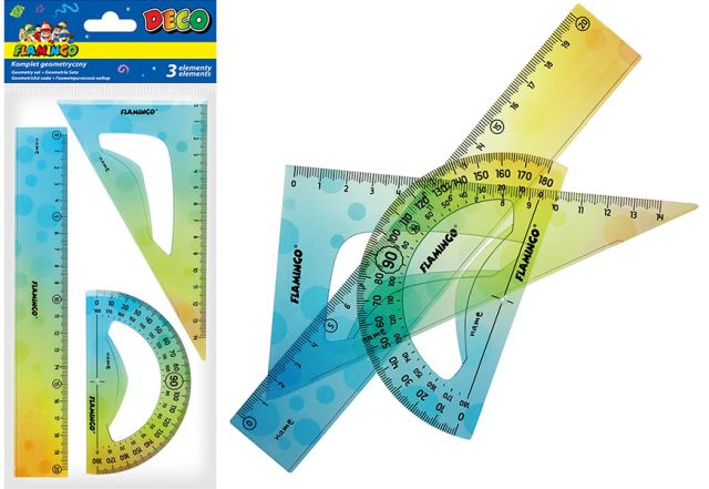 Komplet geometryczny 3 elementy z ozdobym, kolorowym nadrukiem zawiera: linijkę 20cm, ekierkę 14cm, kątomierz