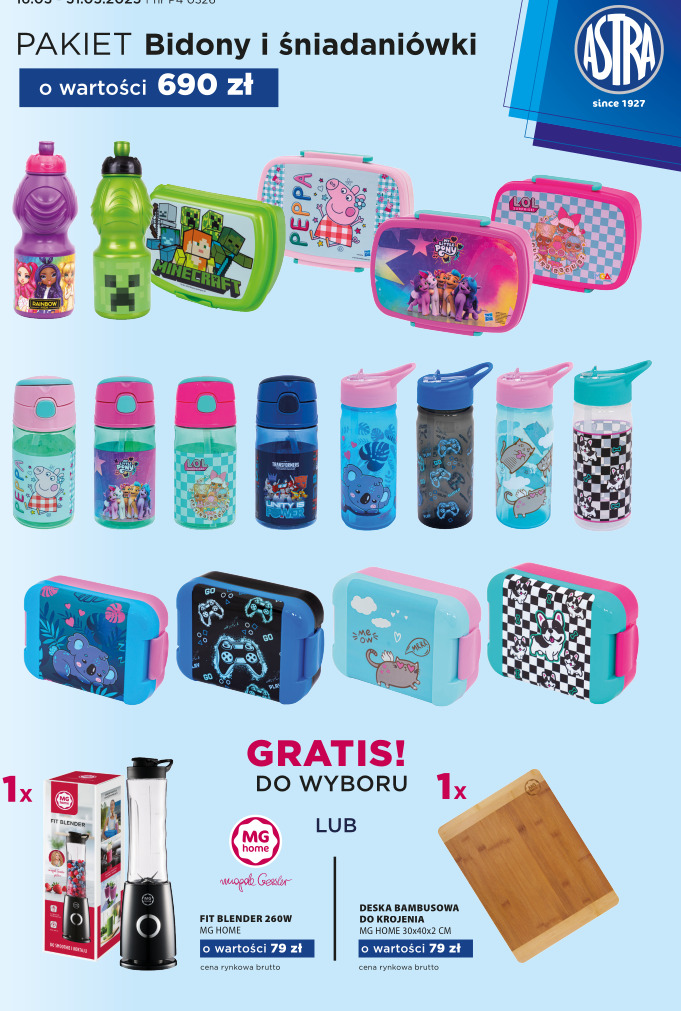Pakiet P04 0326 ASTRA Bidony, Śniadaniówki  o wartości 690zł + GRATIS: blender lub deskaPakiet P04 0326 ASTRA Bidony, Śniadaniówki  o wartości 690zł + GRATIS: blender lub deska