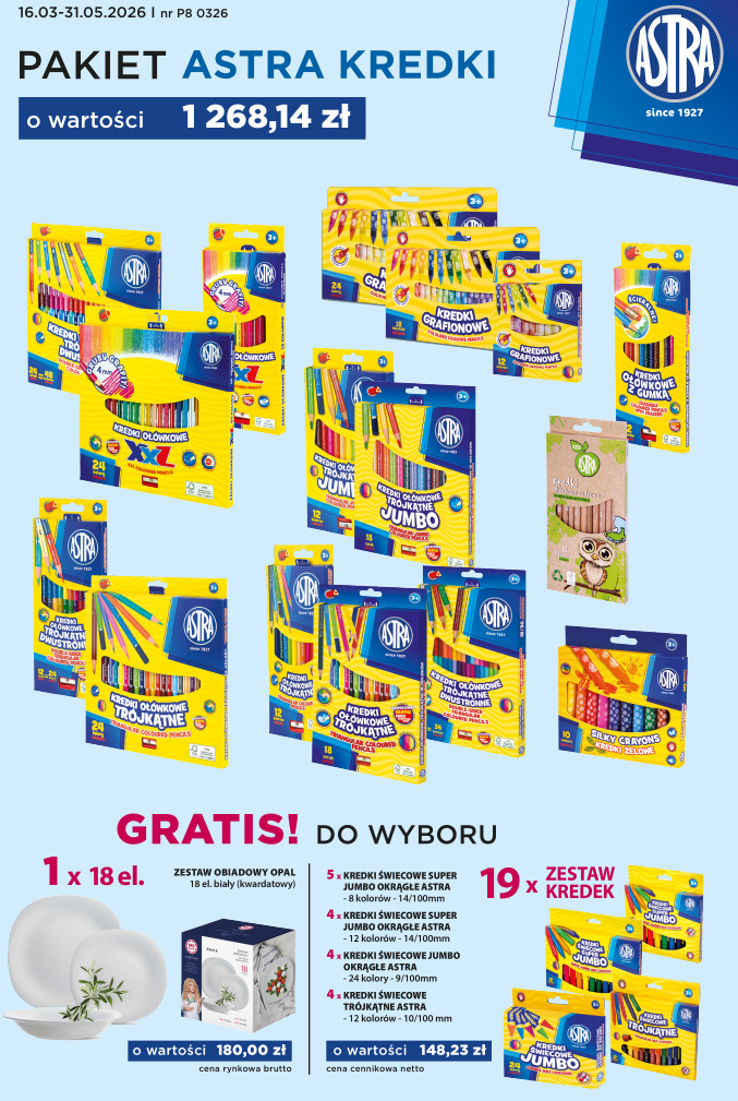 Pakiet P08 0326 ASTRA kredki o wartości 1268, 14 + GRATIS: towar lub talerze