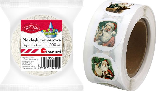 Naklejki papierowe na taśmie O25mm 8 wzorów Boże Narodzenie Mikołaj vintage 500szt. szerokość taśmy 28mm🎅 Naklejki papierowe Boże Narodzenie – Mikołaj vintage, 500szt. na taśmie