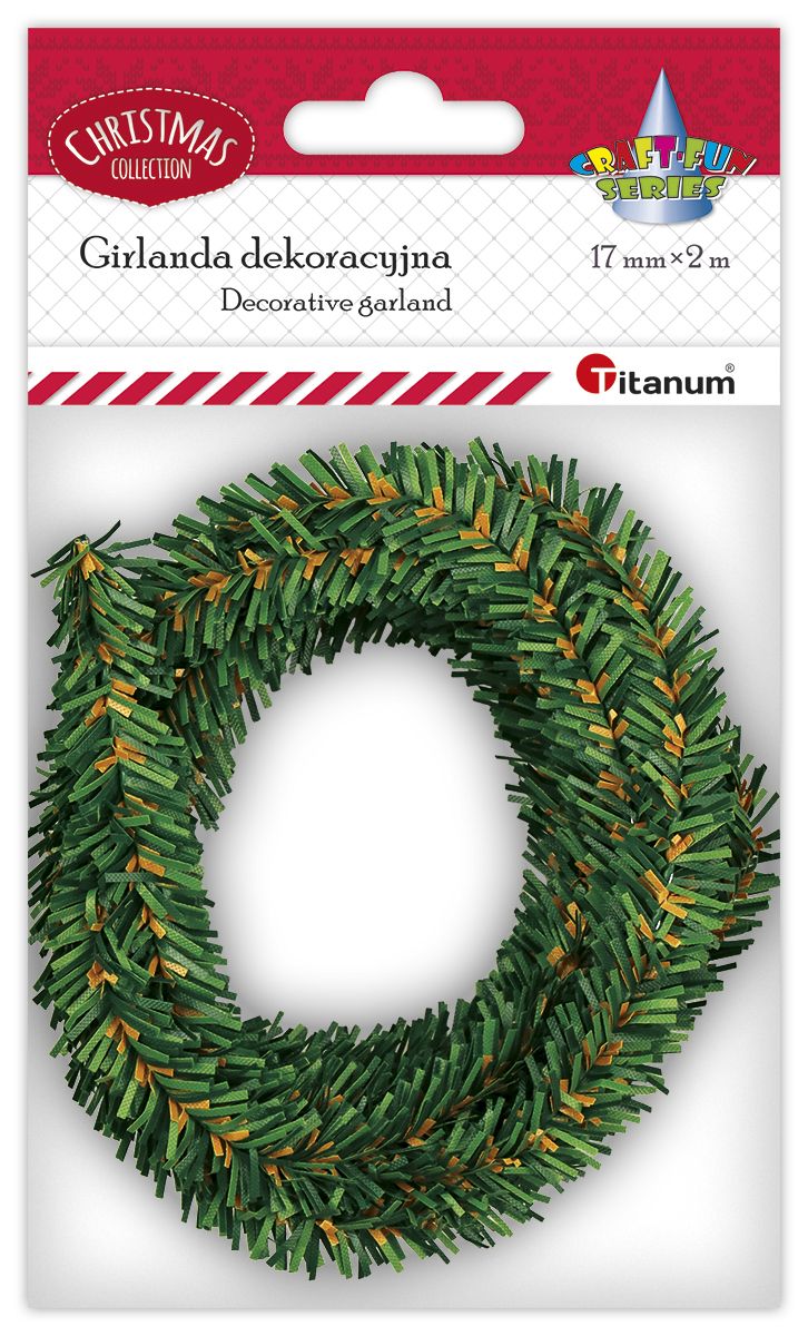 Dekoracja plastikowa girlanda świerkowa O17mm na drucie 2m zielonaGirlanda imitująca świerk, średnica 17 mm, na wygodnym w użyciu drucie, długość: 2 m. |