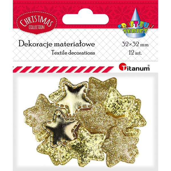 Dekoracje materiałowe gwiazdki PU 35x32mm 3 wzory: drobny brokat, duży brokat, gładkie złote 12szt. |