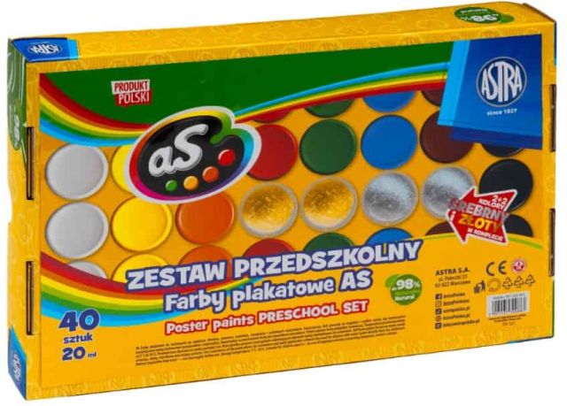 Zestaw przedszkolny Farby plakatowe AS, 40 kol × 20 ml (2 złote, 2 srebrne)Zestaw farb plakatowych AS to idealny wybór dla przedszkoli, świetlic i wszystkich miejsc, gdzie liczy się kreatywna zabawa i bezpieczeństwo najmłodszych. W komplecie znajduje się aż 40 kubeczków farby, w tym wyjątkowe kolory metaliczne – 2 złote... |