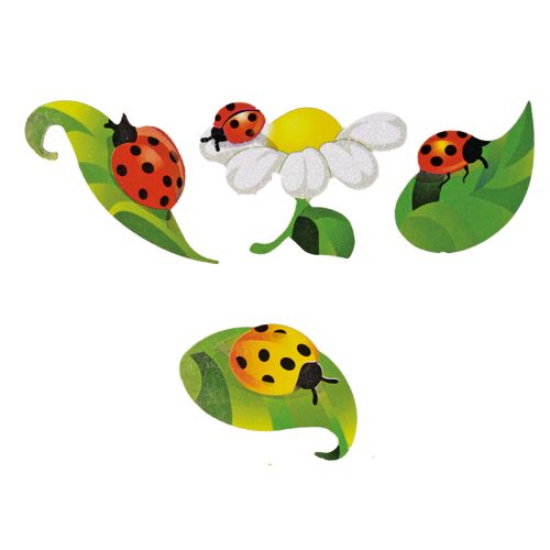 - wzór: biedronki na liściach, na stokrotkach