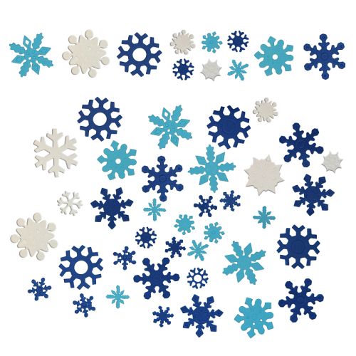 Z pianki. Kształt: płatki śniegu. Kolor: jasnoniebieski, ciemnoniebieski, biały. Wymiary: miks. Ilość: 60 szt.