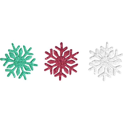 Z pianki, brokatowe. Kształt: płatki śniegu. Kolor: czerwony, zielony, biały. Wymiary: 60 mm. Ilość: 12 szt.