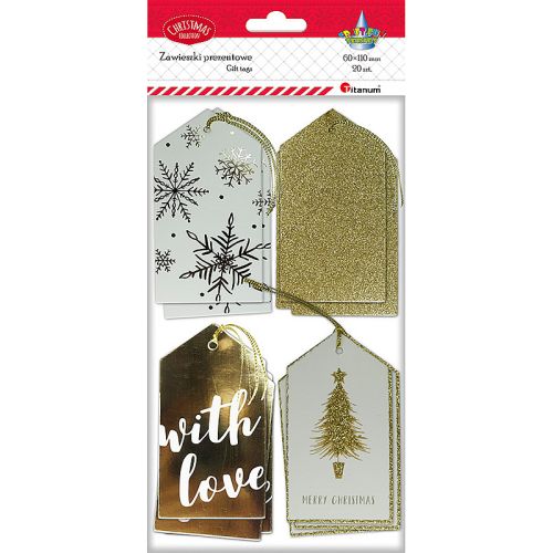 Titanum » Boże Narodzenie » Zawieszki prezentowe » Zawieszki prezentowe Boże Narodzenie 20szt. z nadrukiem jednostronnym 60x110mm tonacja złota + sznureczek złoty 4 wzory