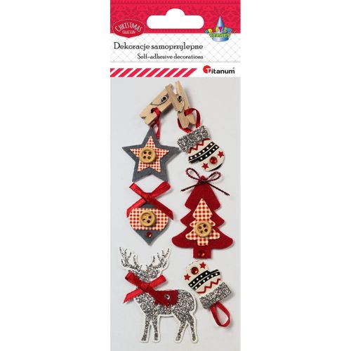 Titanum » Boże Narodzenie » Naklejki Bożonarodzeniowe » Dekoracje samoprzylepne 3D gwiazdka z klamerką, bombka z klamerką, choinka, rękawiczki, renifer 6szt.