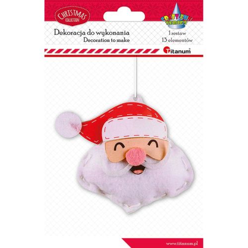 Titanum » Boże Narodzenie » Zestawy kreatywne świąteczne » Zestaw do złożenia filcowa zawieszka głowa Mikołaja 11x11, 5cm: 2 filcowe kształty, 8 filcowych naklejek, 1 włóknina, 1 mulina, 1 plastikowa igła 13 e