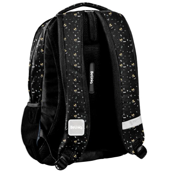 Plecak szkolny. Trzy pojemne komory, kieszeń przednia z organizerem, 2 boczne kieszenie z siatki+materiał. Wzmocnione profilowane plecy, miękkie wygodne szelki. Wzmocniony i usztywniony spód. Wygodny uchwyt do przenoszenia i uszko do powieszenia. W komorze głównej przegroda (na laptop), w drugiej komorze organizer z kieszenią na zamek, uchwyt na klucze. Elementy odblaskowe dla większego bezpieczeństwa. Wykonany z materiału wodoodpornego. 41x30x20