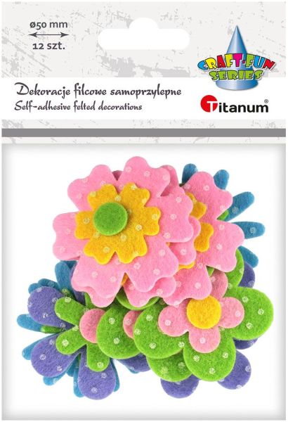 Titanum » Artykuły dekoracyjne całoroczne » Filce i Pianki: naklejki i dekoracje » Naklejki filcowe 3D kwiaty O50mm 4 wzory mix kolorów 12szt.
