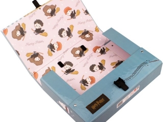Teczka walizeczka - kartonowa/sztywna teczka z rączką, zapinana plastikowym mechanizmem z przodu. Doskonała dla przechowywania i przenoszenia zeszytów, brulionów, dokumentów, zdjęć, bloków rysunkowych, kredek i wielu innych. Kolorowa na zewnątrz, pokryta połyskową folią, wewnątrz zadruk w jednym kolorze dopasowany kolorystycznie do zewnętrznej części teczki. Motyw z serii Harry Potter