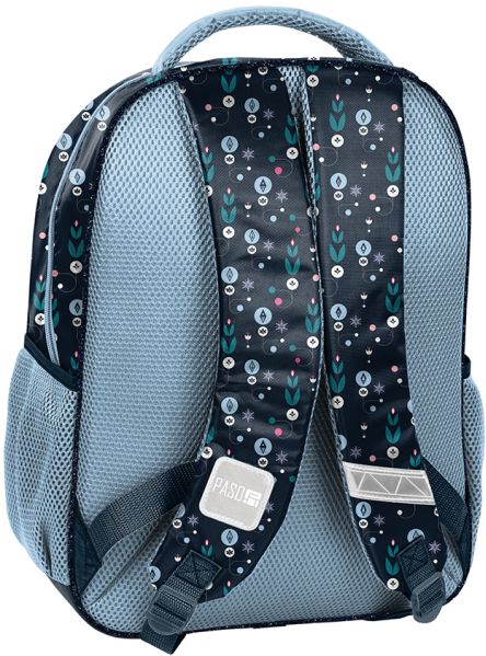 Plecak dwukomorowy szkolny, jedna płaska mała kieszeń na froncie, dwie boczne kieszenie z siatki (mieszczą małą butelkę, bidon lub termos). Elementy odblaskowe, usztywnione plecy pokryte siatką. Wygodny uchwyt do przenoszenia. Wygodne pullery ułatwiające odpinanie zamków. Wymiary: 41x31x15