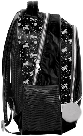 Plecak dwukomorowy szkolny, jedna płaska mała kieszeń na froncie, dwie boczne kieszenie z siatki (mieszczą małą butelkę, bidon lub termos). Elementy odblaskowe, usztywnione plecy pokryte siatką. Wygodny uchwyt do przenoszenia. Wygodne pullery ułatwiające odpinanie zamków.41x31x15