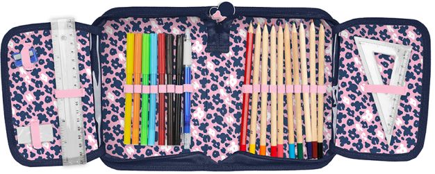Piórnik jednokomorowy z dwoma klapkami z wyposażeniem (długopis, ołówek, 7 pisaków, 9 kredek, gumka, linijka, temperówka, ekierka). Zadrukowane kolorowe wnętrze. Wymiary: 19,5x13x3,5