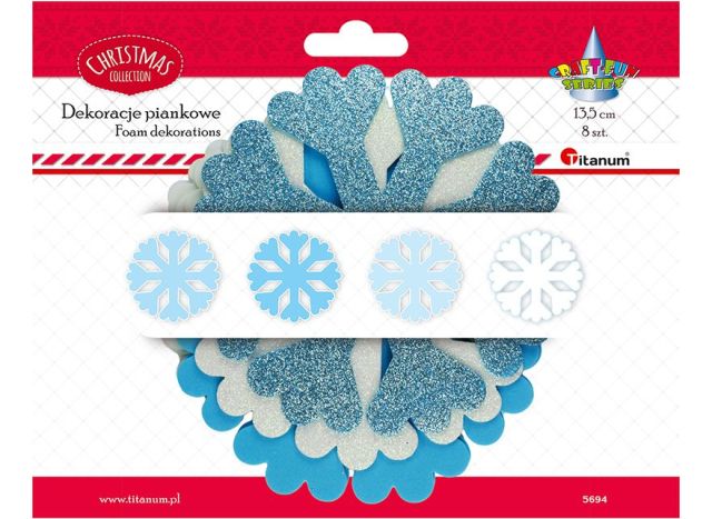 Titanum » Boże Narodzenie » Dekoracje i naklejki z filcu i pianki » Piankowe płatki śniegu 13, 5cm 2xniebieskie, 3xbiałe, 1xbiała brokatowa, 1xniebieska brokatowa 8szt.