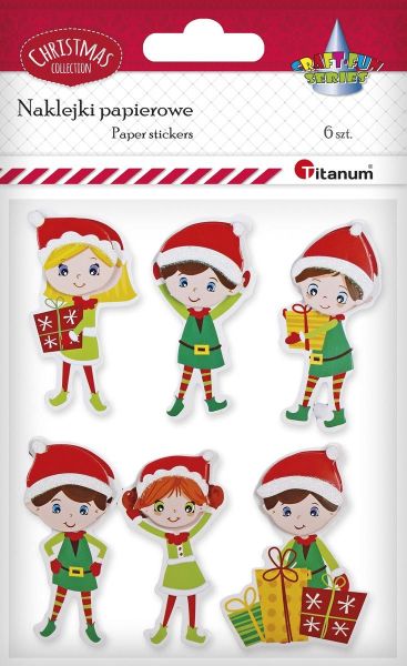Naklejki papierowe, wzór: Elfy Mikołaja. 6 sztuk.