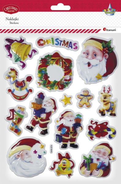 Titanum » Boże Narodzenie » Naklejki Bożonarodzeniowe » Naklejki wypukłe napis Christmas, wianek, Mikołaje, zabawki 15szt.