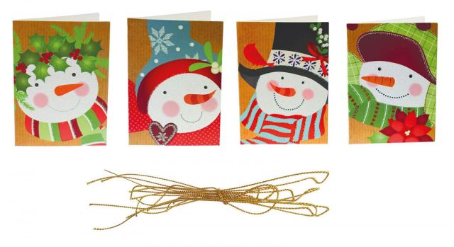 Karnety prezentowe, wzór: Boże Narodzenie, wymiary: 50 x 70 mm, 4 wzory: brokatowane głowy bałwanków. 8 sztuk + sznureczek 1,5 m.