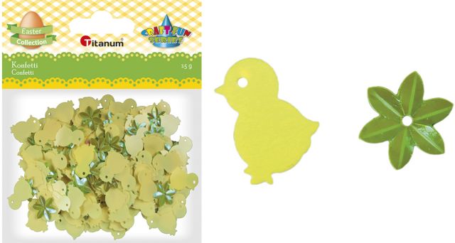 Titanum » Artykuły dekoracyjne całoroczne » Wielkanoc » Konfetti Kurczaczki 15x17mm żółte, cekiny kwiaty 13mm zielone 15g TITWLK26