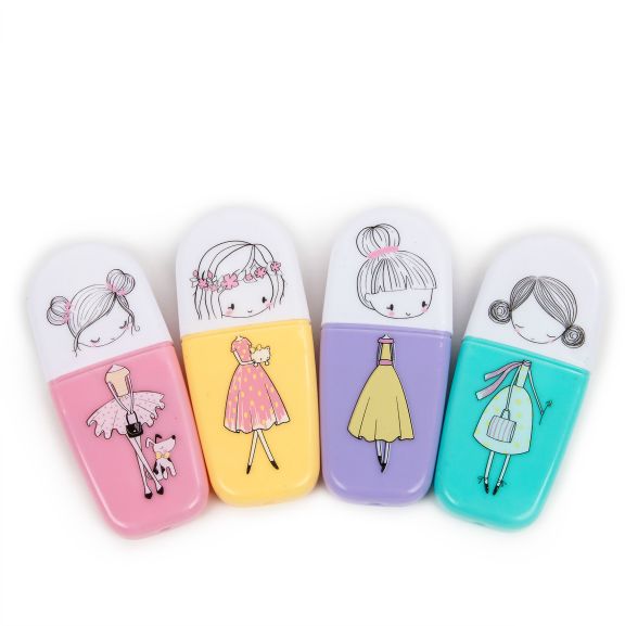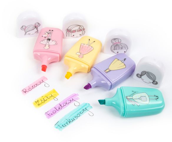 Zakreślacze pastelowe w czterech kolorach: różowym, żółtym, fioletowym oraz turkusowym. Na każdym z zakreślaczy znajduje się stylowa księżniczka. Zmieniąjąc zakrętki z główkami księżniczek można bawić się i przebierać je w różne stylizacje znajdujące się na zakreślaczach, jednoczesnie nadając im zupełnie nowy look. Mini zakreślacze zmieszczą się w każdym piórniku, a notatki wykonane z ich pomocą będą wyglądały przejrzyście i estetycznie, tym samym pomagając w szybszym przyswojeniu wiedzy.