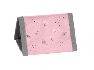 Portfel ze sznurkiem do zawieszania. Jedna przegródka na zamek na monety, jedna przeźroczysta kieszonka np. na zdjęcie, dwie dodatkowe kieszonki, jedna kieszeń przez całą długość rozłożonego na płasko portfela.