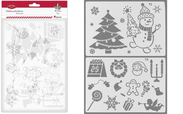 Titanum » Boże Narodzenie » Szablony i nożyczki świąteczne » Szablony plastikowe 260x178mm 2szt. bałwanek z choinką, choinka / wieniec, kartka z kalendarza 25, głowa Mikołaja, ciastek, lizak, prezent, archanioł,