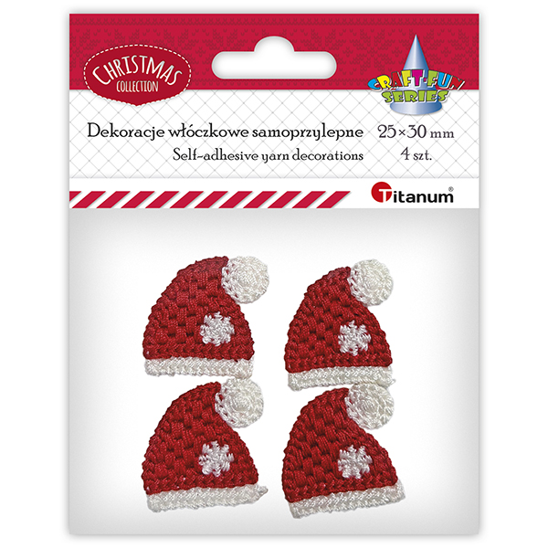 Titanum » Boże Narodzenie » Naklejki Bożonarodzeniowe » Dekoracje samoprzylepne czapeczki włóczkowe 30x30mm czerwono-białe 4szt.