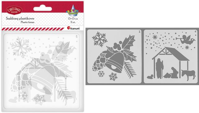 Titanum » Boże Narodzenie » Szablony i nożyczki świąteczne » Szablony plastikowe 130x130mm 2szt. stroik z dzwonkiem, płatki śniegu / stajenka w Betlejem