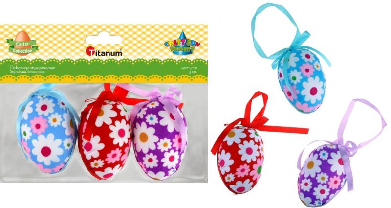 Titanum » Artykuły dekoracyjne całoroczne » Wielkanoc » Dekoracje styropianowe jajka zawieszki 45x70mm obleczone materiałem w kwiaty 3 kolory 3szt. kolory: czerwone, fioletowe, niebieskie TITWLK26