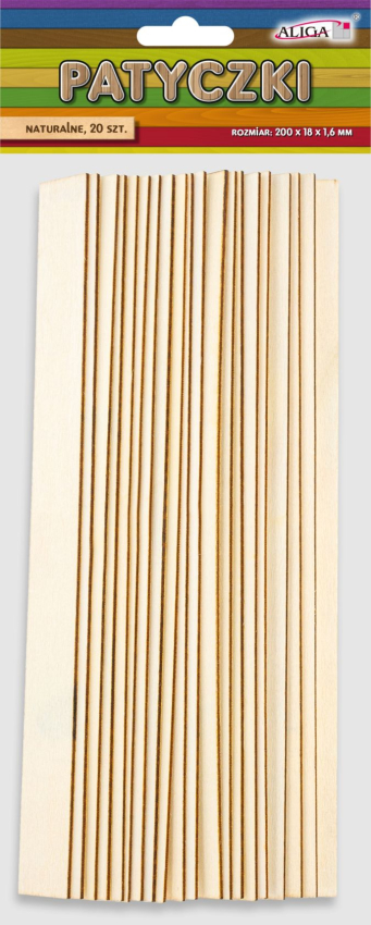 Aliga » Artykuły Dekoracyjne Całoroczne » Patyczki » Patyczki PK-2563 drewniane naturalne, 20szt. rozm. 200x18x1, 6mm