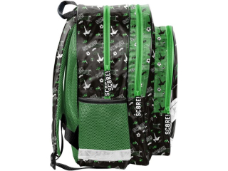 Plecak szkolny. Dwie duże komory zapinane na zamek, jedna bardzo obszerna kieszeń na śniadanie, boczne kieszenie z siatki (mieści się butelka, mały termos lub bidon). Usztywniane, ergonomicznie wyprofilowane plecy pokryte siatką. Wymiary: 38x29x16
