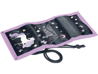 Portfel ze sznurkiem do zawieszania. Jedna przegródka na zamek na monety, jedna przeźroczysta kieszonka np. na zdjęcie, dwie dodatkowe kieszonki, jedna kieszeń przez całą długość rozłożonego na płasko portfela. Wymiary: 12x8,5x1